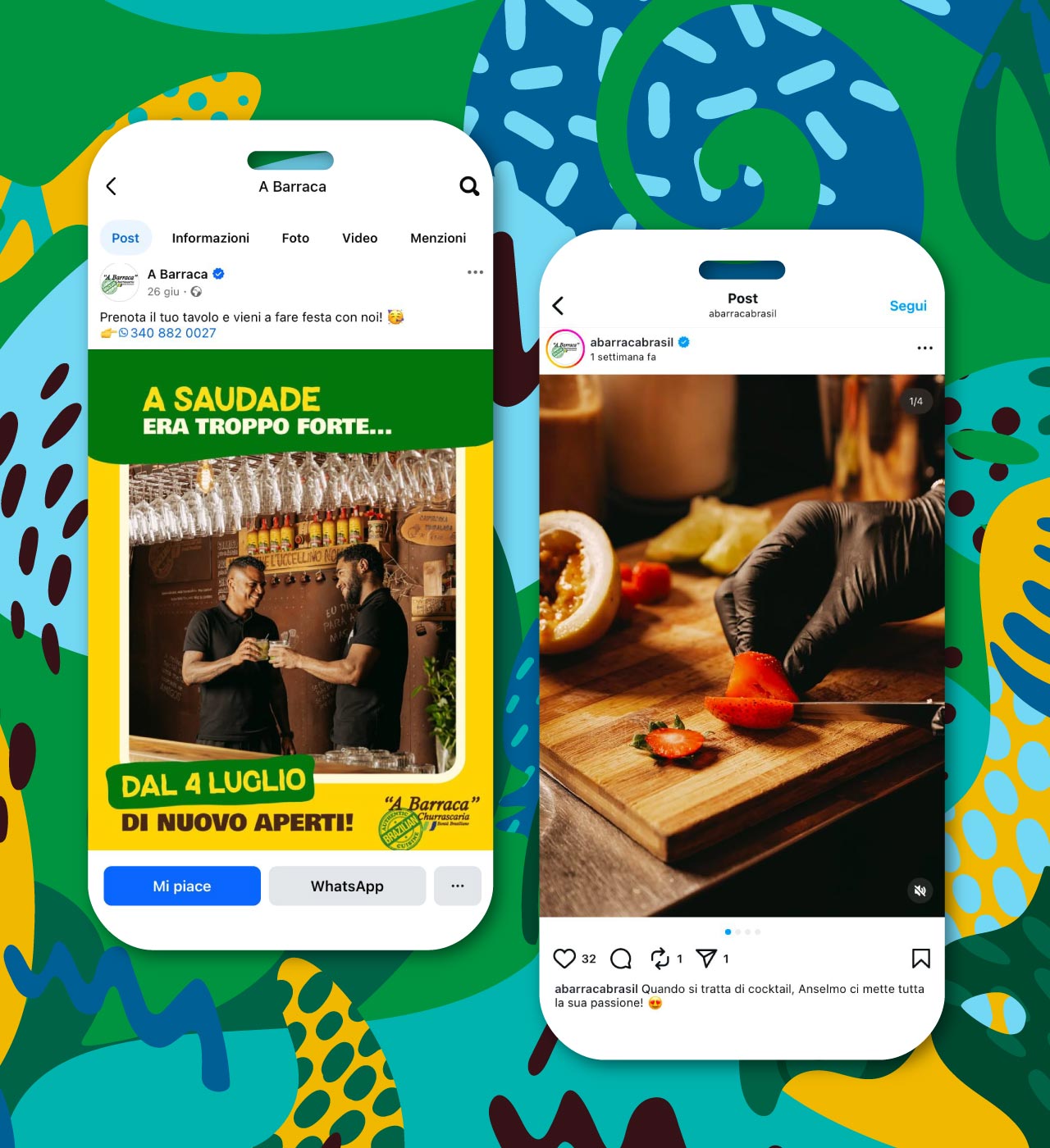 La gestione dei canali social completa il progetto, con una comunicazione costante e coerente, pensata per avvicinare il brand alle persone e rendere l’esperienza di A Barraca riconoscibile anche online.