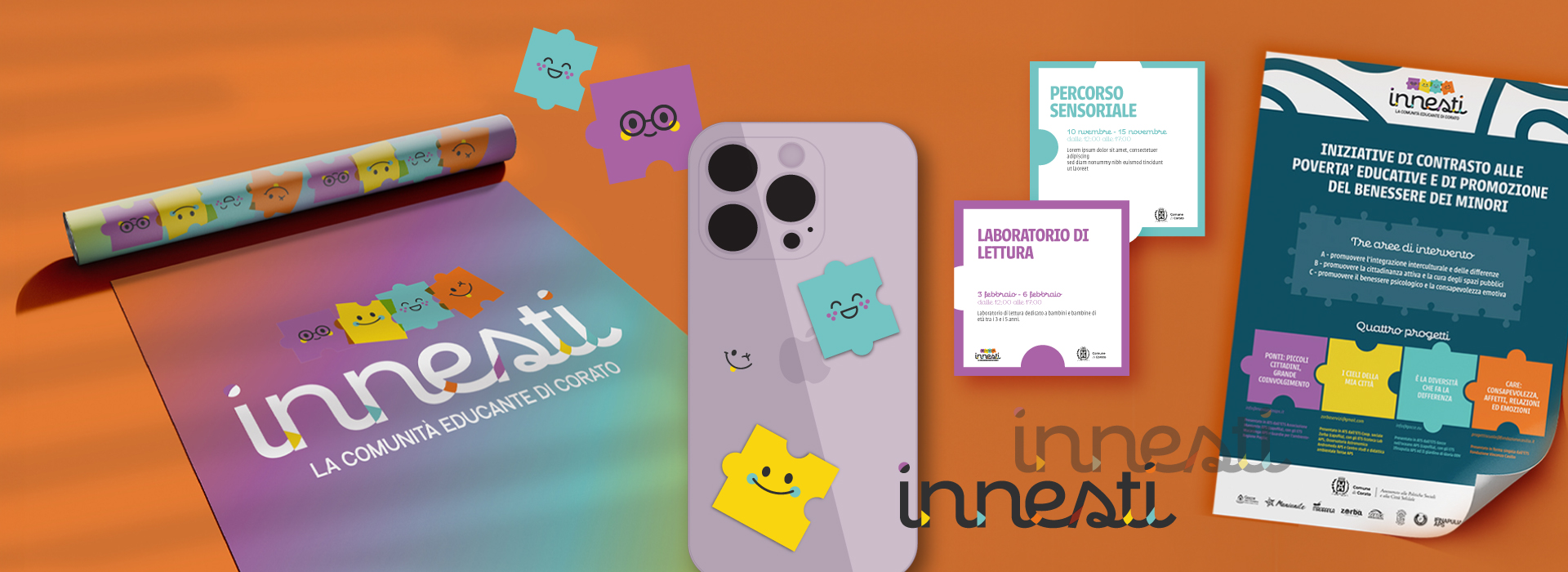Per Innesti abbiamo realizzato un logo che rappresenta l’essenza del progetto che riguarda attività di promozione del benessere dei minori. Il logo è composto da quattro pezzi di puzzle, ognuno di un colore diverso, che simbolizzano i quattro progetti cardine dell’evento. L’immagine richiama l’idea di unione, crescita e integrazione: valori chiave di Innesti. I puzzle evocano il gioco e l’apprendimento del mondo dei minori, rafforzando il messaggio di un’esperienza concreta e interattiva. Il design modulare del logo permette un utilizzo versatile, adattandosi a contenuti digitali e fisici, garantendo coerenza visiva e rafforzando l’identità del progetto su più piattaforme.